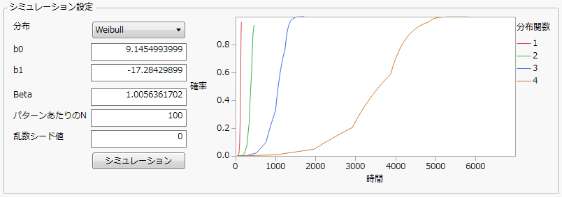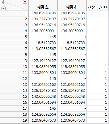 シミュレーションの結果(一部)は、シミュレーションされたデータテーブルの一部です。「パターンID」が「1」であるデータでは、すべてのデータが145分以下となっています。起動ウィンドウの「パターンの延長」で[終了する]を選択したため、「パターンID」が「1」である条件に関しては、145分を越えたデータは右側打ち切りにしています。