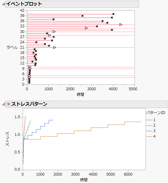 「累積損傷」プラットフォームでは、ステップストレス試験(負荷を段階的に変化させる試験)などの、ストレスの大きさを時間とともに変化させる加速寿命試験を分析します。試験で与えるストレスには、荷重・温度・圧力などがあります。多くのストレス試験では、複数のユニットを試します。各ユニットに対して、ある水準のストレスから試験を始めて、試験を進めていく過程で、そのストレスの大きさを変化させます。分析対象となる応答は、故障時間(特定のイベントが生じるまでの時間)です。「累積損傷」プラットフォームでは、故障イベントをプロットしたり、複数の確率分布をあてはめたりできます。