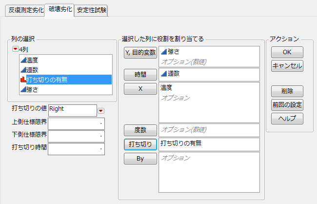 [分析]>[信頼性分析/生存時間分析]>[劣化分析]を選択します。