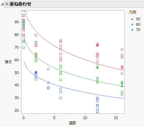 ここでの例では、独自の非線形モデルを自分で指定します。このデータテーブルには、接着剤の強度に関する測定データが記録されています。接着剤がはがれるまで製品に圧力を加え、必要な破壊応力を記録しました。通常の使用条件下ではユニットが破壊することは稀なので、加速因子(温度)でいくつかの水準を設定して試験しました。25oCの状態で52週間(1年間)使用した後のユニットの強度(単位はニュートン)を推定してみましょう。