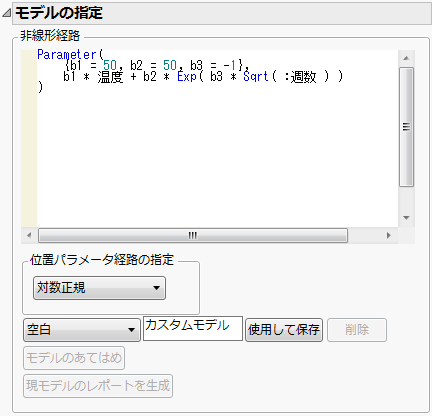 「モデルの指定」アウトラインにある「位置パラメータ経路の指定」パネルのメニューから[対数正規]を選択します。