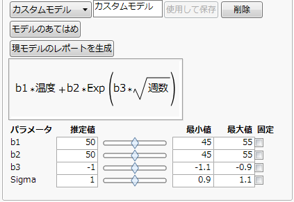 b1 * :温度 + b2 * Exp( b3 * Sqrt( :週数 ) )