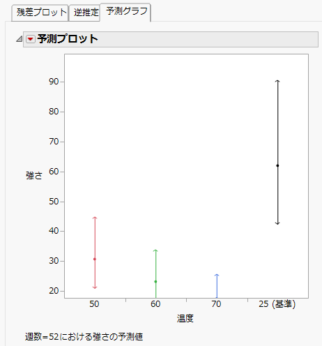 次に、25oCを基準として52週間使用した後の「強さ」の予測値と予測区間を求めましょう。