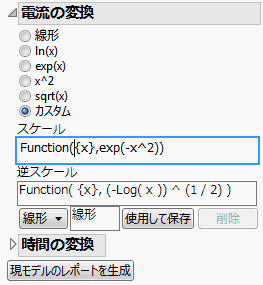 選択肢にない変数変換を行う必要がある場合は、[カスタム]オプションを使用します。たとえば、応答変数をexp(-x2)と変換する場合は、[カスタム]変換のオプションのとおりに「スケール」ボックスに入力します。このとき、場合によっては「逆スケール」ボックスにおいて変換式の逆関数も入力してください。