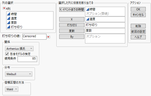 この例では、サンプルデータフォルダ内の「Reliability」フォルダにある「Capacitor ALT.jmp」を使用します。これは、仮想的な信頼性試験データで、3水準の温度に対して故障数と打ち切り数を乱数シミュレーションしたものです。データは、摂氏85度・105度・125度の温度で、右側打ち切りで試験したものになっています。