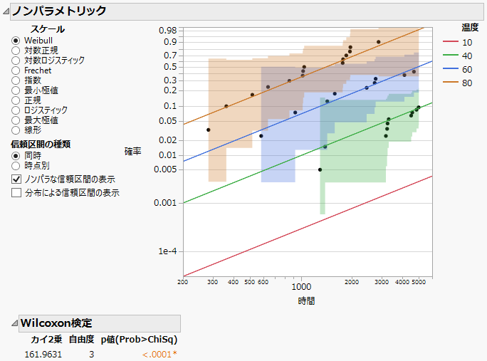散布図の下には、ノンパラメトリックな累積分布関数を重ね合わせて描いたプロット(「ノンパラメトリック」プロット)が表示されます。このプロットでは、グループ間の違いを視覚的に見ることができます。「Devalt.jmp」サンプルデータの場合、「時間」の違いを検討するために、さまざまなスケールを指定できます。また、確率プロットのノンパラメトリック推定に対する信頼区間の種類として、[同時]と[時点別]のいずれかを選択できます(この結果は[ノンパラな信頼区間の表示]がオンの場合に表示されます)。さらに、[分布による信頼区間の表示]と[ノンパラな信頼区間の表示]のいずれかを選択できます。