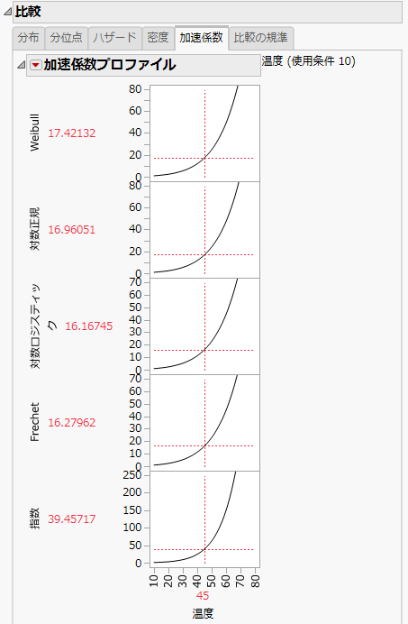 最初の5つのタブには、選択した確率分布のプロファイルが表示されています。最初の4つのプロファイルに表示される曲線は、それぞれ故障時間と説明変数に対応しています。なお、[加速係数]タブの曲線は、加速因子(説明変数)だけの関数です。分布プロファイルは、Weibull・対数正規・Fréchet・対数ロジスティックの各確率分布に対する「分布プロファイル」です。