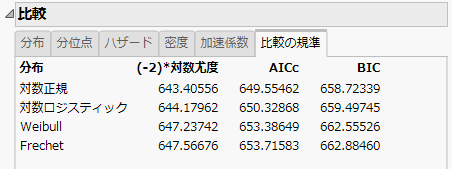 [比較の規準]タブには、あてはめた分布に対して、(-2)* 対数尤度・AICc・BIC の各規準が表示されます。分析レポートの[比較の規準]タブに、Weibull・対数正規・対数ロジスティック・Fréchetの各分布に対する結果を示します。データへのあてはまりの良い分布が「比較の規準」表の一番上に表示されます(「AICc」を基準に並べ替えられます)。