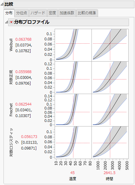 [分位点]・[ハザード]・[密度]の各タブにも同様の結果が表示されます。「分布プロファイル」・「分位点プロファイル」・「ハザードプロファイル」・「密度プロファイル」・「加速係数プロファイル」は、他のプラットフォームで作成される予測プロファイルと似ています。たとえば、「温度」と「時間」の縦の線をドラッグすれば、温度と時間を変更したときの分布の値の変化を調べることができます。予測プロファイルについては、『プロファイル機能』の「プロファイル」章に詳しい説明があります。