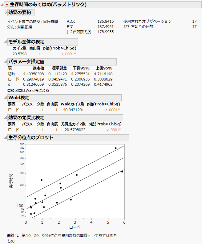 「生存時間(パラメトリック)のあてはめ」は、「モデルのあてはめ」を若干カスタマイズしたものです。なお、「非線形回帰」プラットフォームでも、パラメトリックな生存時間モデルをあてはめることができます。