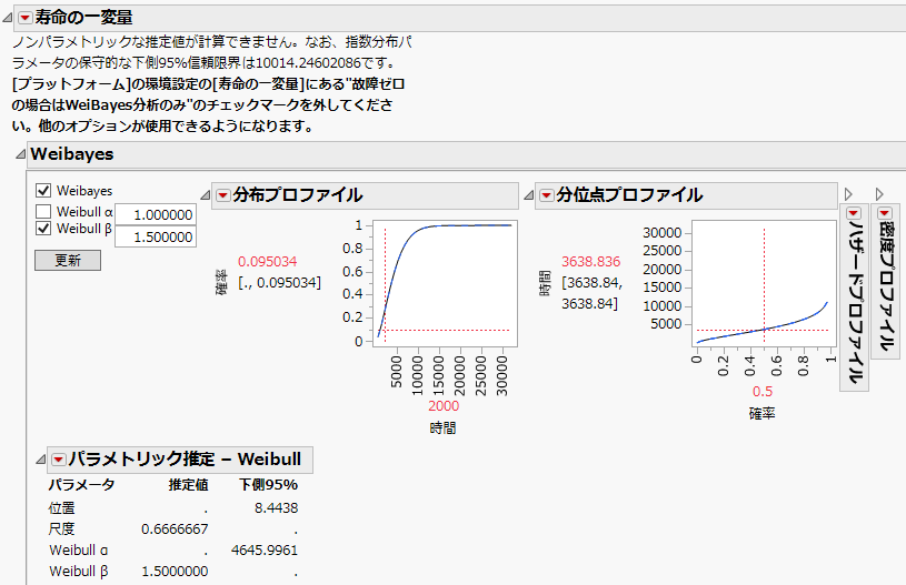 Weibayes推定値を得るには、[Weibayes]および[Weibull β]オプションを必ず選択してください。[Weibull β]の値を変更して[更新]をクリックします。すると、推定値とプロファイルが更新されます。プロファイルに表示される値は、保守的な信頼区間を使用しています。例として、第 “故障がまったくないデータに対するWeibayes分析の例”を参照してください。