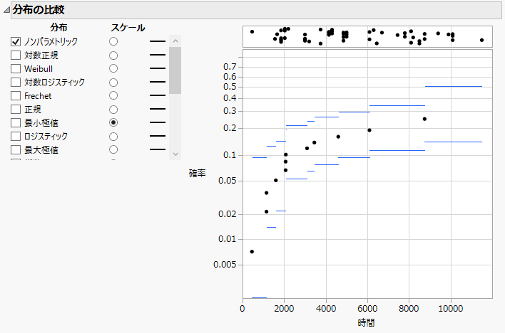 ノンパラメトリック推定値が直線に沿わなくなります(最小極値のスケールで表示したノンパラメトリック推定値)。つまり、最小極値分布は適切でないことがわかります。