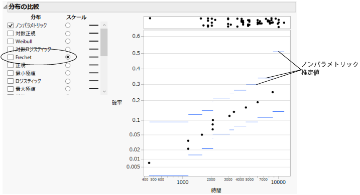 「分布の比較」のグラフで、デフォルトで使われているスケールは、線形スケールです。ここでは、Fréchet分布のスケールに変更してみましょう。1