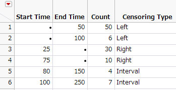 2つのY列が指定された場合、区間打ち切りであるとみなされます。区間打ち切りデータの場合は、各ユニットに対して、最初のY列を上限、二番目のY列を下限とみなします。2つのY列で表される打ち切りの種類に、2つのY列によって、右側打ち切り(Right)・左側打ち切り(Left)・区間打ち切り(Interval)を表す例を示しています。2つのY列を用いた打ち切りについての詳細は、第 “2つの「故障までの時間」列”を参照してください。