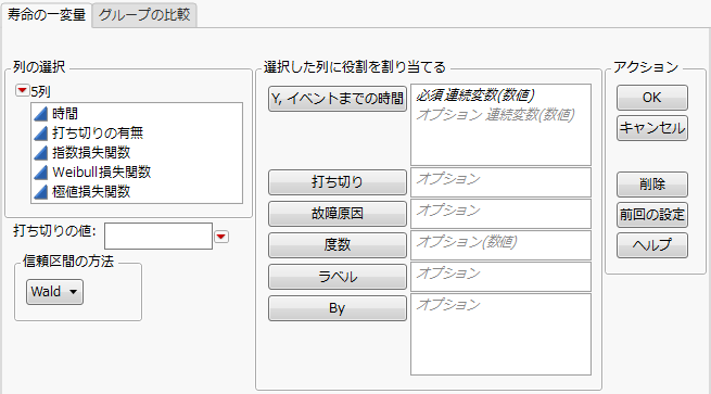 [故障原因の列で打ち切りを表す値]は[故障原因の列]において右側打ち切りであったことを示すデータ値を指定します。このオプションを選択した後、表示されたテキストボックスに、右側打ち切りを示すデータ値を入力してください。ボックスの右側にあるリストから、該当のデータ値を選択することもできます。