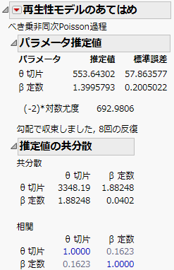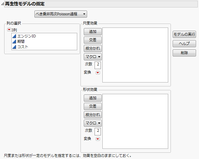 「再生性モデルの指定」ウィンドウ(「再生性モデルの指定」ウィンドウ)で「尺度効果」や「形状効果」を指定した場合、尺度パラメータと形状パラメータで示した尺度と形状のパラメータが、それらの指定された効果(説明変数)の関数として、モデル化されます。尺度や形状のパラメータが一定であるモデルをあてはめたい場合は、「尺度効果」と「形状効果」に何も指定しないでください。
