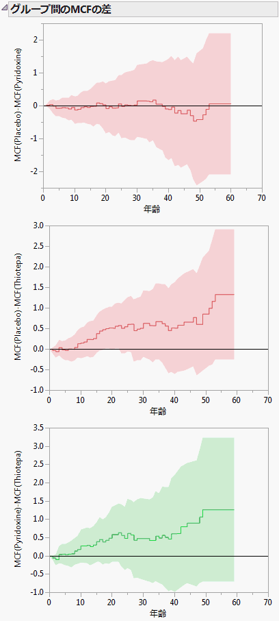 異なる処置の間に統計的に有意な差があるかどうかは、差のプロットで信頼区間を調べるとわかります。0が信頼区間に入っていない年齢においては、処置間に有意な差があります。MCFの差のグラフは、処置間に有意な差がないことを示しています。