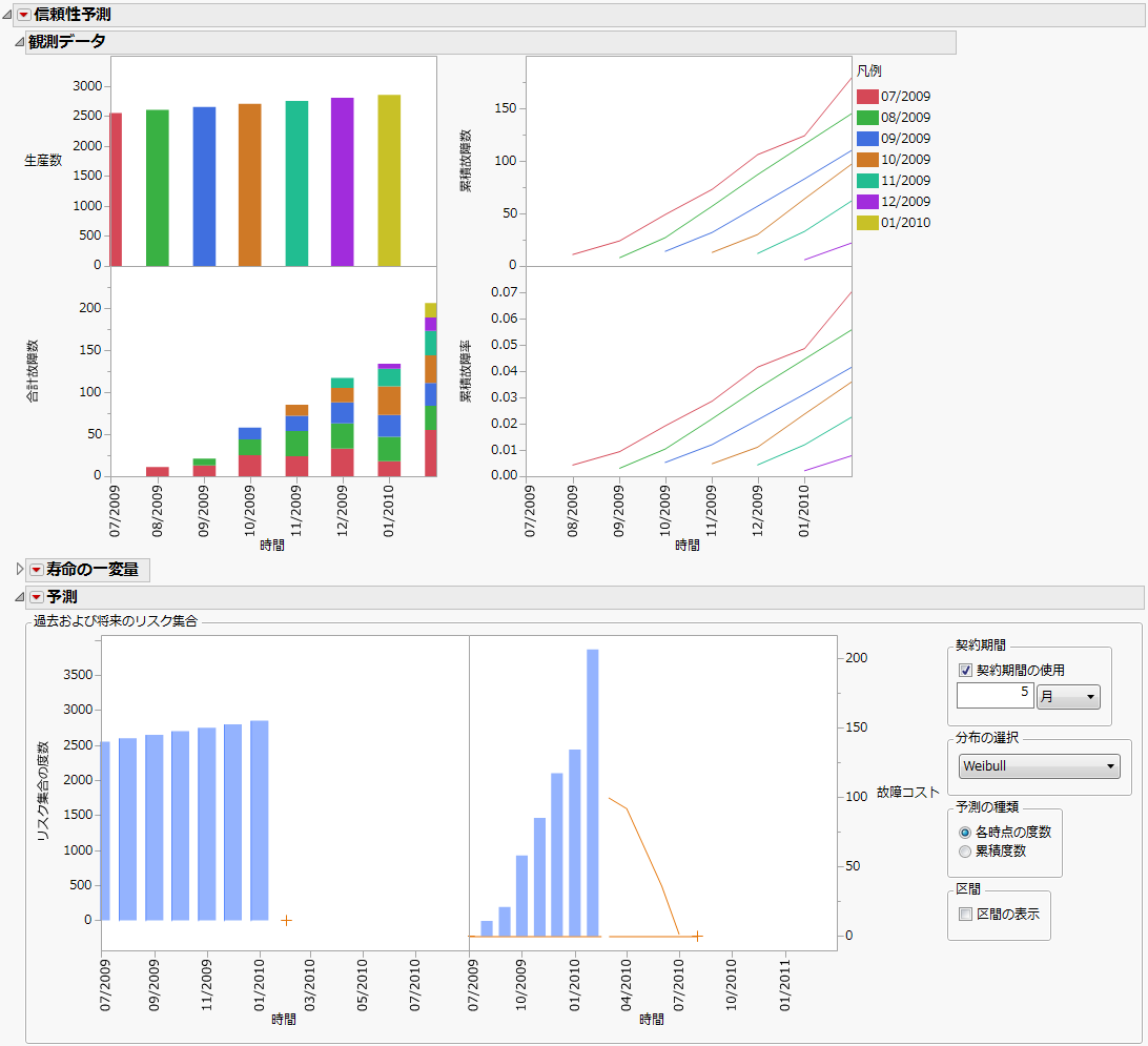 「信頼性予測」は、製品の故障数を予測するプラットフォームです。まず、製造日・生産数・故障発生日・故障数のデータから、寿命分布を推定します。
