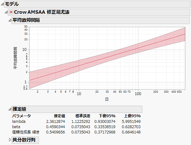 [Crow-AMSAA 修正最尤法]オプションを選択すると、「累積イベント数」グラフにこのモデルの結果が追加されます。このオプションを選択すると、「モデルリスト」も更新されます。また、「Crow-AMSAA 修正最尤法」レポートが開き、Crow-AMSAA修正最尤法の「平均故障間隔」グラフ・「推定値」・「共分散行列」が表示されます。「平均故障間隔」グラフについては、第 “「平均故障間隔」グラフ”節で説明しています。