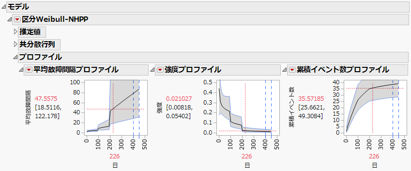 区分モデルの推定値・標準誤差・信頼区間でも、単純なCrow-AMSAAモデルと同じように、最尤推定の枠組みが使われます。詳細は、第 “Crow-AMSAAモデルのパラメータ推定値”を参照してください。この節で説明したような区分モデルに基づき、累積イベント数に関する制約のもとで、追加のパラメータが最尤推定されます。