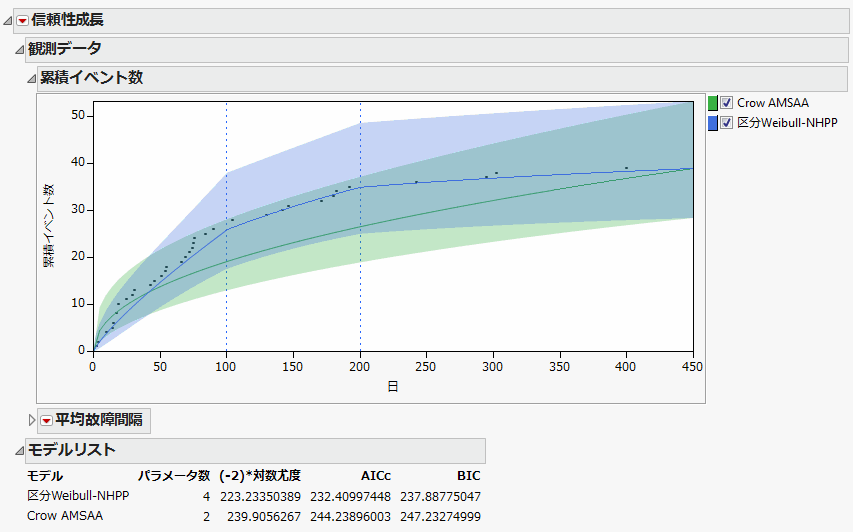 このオプションを実行すると、「累積イベント数」グラフに区分モデルの結果が追加されます。青い縦の点線は、フェーズ間の境界を示します。また、このオプションを選択すると、「モデルリスト」も更新されます。「累積イベント数」グラフと「モデルリスト」レポートでは、「TurbineEngineDesign1.jmp」のデータに、Crow-AMSAAモデルと、区分Weibull-NHPPモデルをあてはめています。「モデルリスト」レポートには、両モデルのモデル選択規準が示されています。