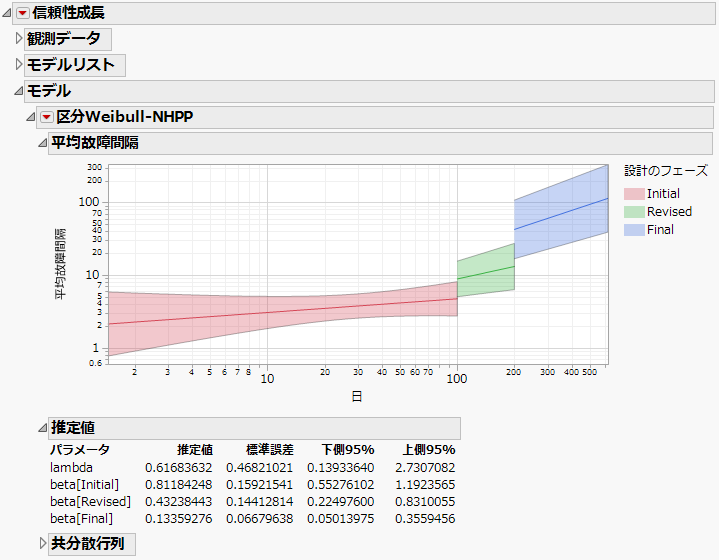 デフォルトでは、「区分Weibull-NHPP」レポートには、推定された「平均故障間隔」グラフが表示されます。フェーズは色分けされています。このグラフの下に、「推定値」および「共分散行列」レポートが表示されます。(「区分Weibull-NHPP」レポートを参照)。