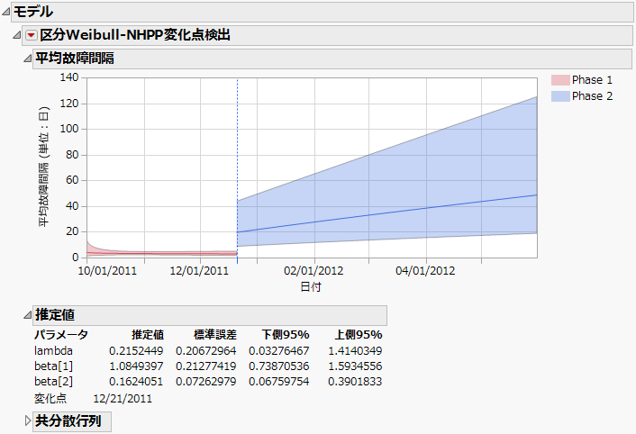 デフォルトの「区分Weibull-NHPP変化点検出」レポートには、「平均故障間隔」グラフ・「推定値」・「共分散行列」が表示されます。「区分Weibull-NHPP変化点検出」レポートは、「Reliability」フォルダの「BrakeReliability.jmp」サンプルデータを用いたときのものです。この例では、「推定値」レポートの下部の「変化点」に「12/21/2011」と表示されていますので、変化点は2011年12月21日であると推測されます。なお、標準誤差や信頼区間は、変化点が既知であるという前提で算出されています。このグラフと「推定値」レポートについては、第 “区分Weibull-NHPP”に説明があります。