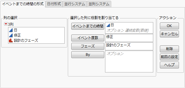 他の3つのデータ形式は、試験の開始時点から、故障が生じた時点までの時間です。[イベントまでの時間の形式]タブでは、ゼロ時点からの時間が含まれている列に、[イベントまでの時間]の役割を割り当ててください。