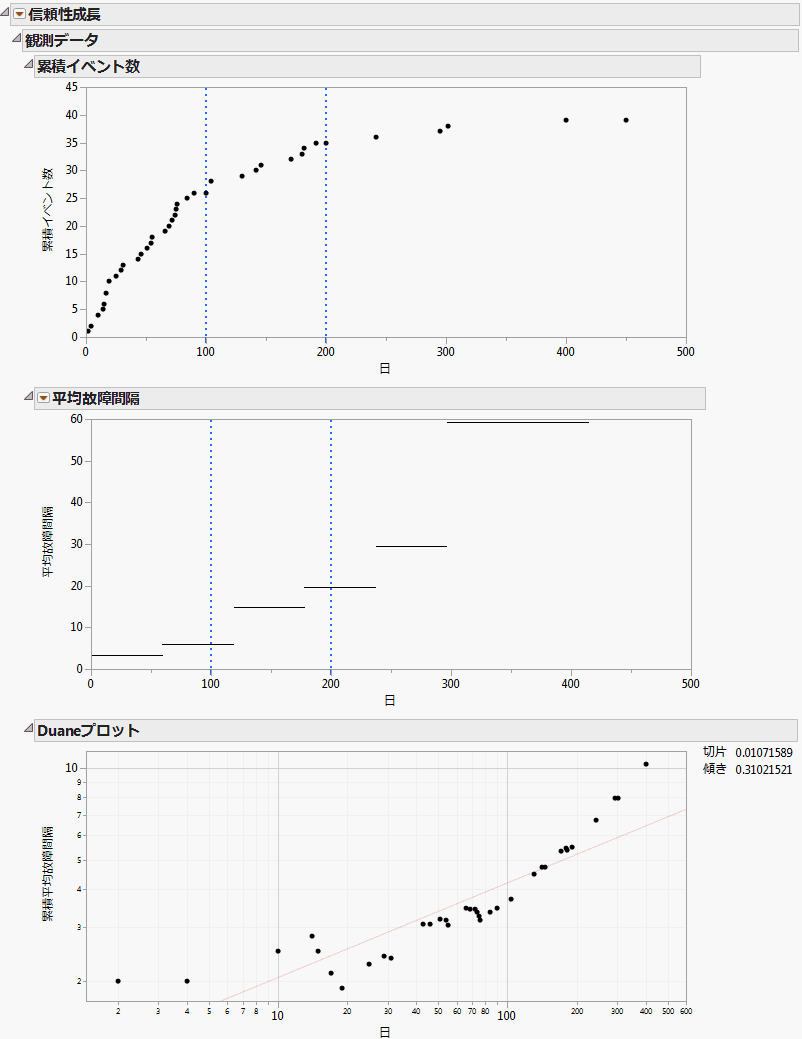 「観測データ」レポートには、デフォルトで、「累積イベント数」グラフ・「平均故障間隔」グラフ・「Duaneプロット」が含まれます。「観測データ」レポートは、「平均故障間隔」グラフと「Duaneプロット」を開いた状態のレポートです。このレポートを作成するには、第 “「信頼性成長」プラットフォームの例”の手順に従います。