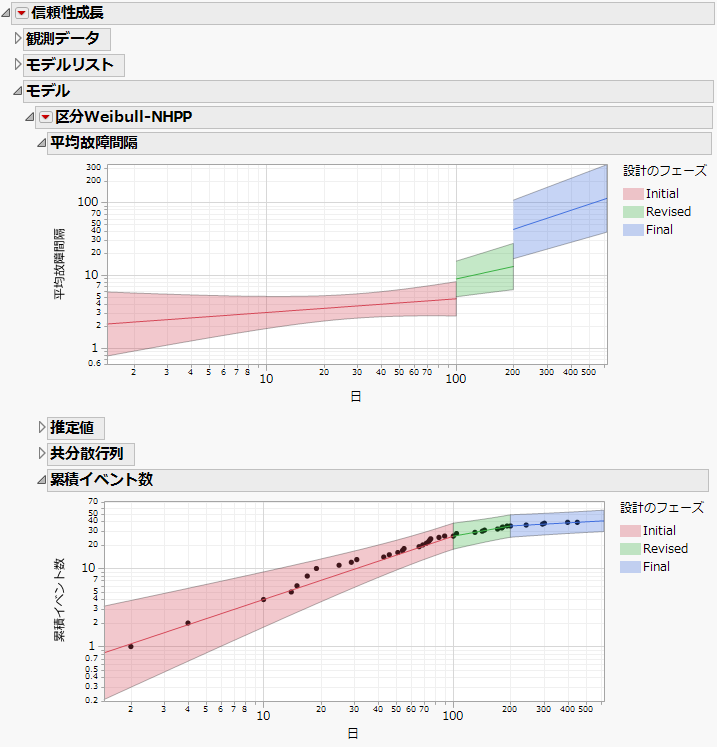 「信頼性成長」プラットフォームは、Crow-AMSAAモデルをあてはめます。このモデルは、非同次Poisson過程モデルの1つで、強度関数がWeibull型の関数になっています。なお、「信頼性成長」プラットフォームでは、フェーズごとに、個別のCrow-AMSAAモデルをあてはめることもできます。また、複数のシステムにモデルをあてはめることもできます。