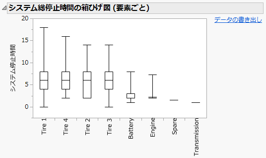 「修理可能システムのシミュレーション結果 - Number」の隣の赤い三角ボタンをクリックし、[システム総停止時間の箱ひげ図(要素ごと)]を選択します。