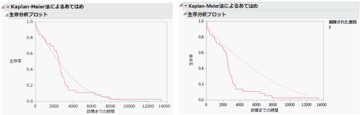 原因を削除したときの生存時間プロットは、競合する原因をすべて含めた生存時間プロットと原因9を除去した生存時間プロットです。原因9を除去したプロットを見ると、2,000時間までは生存率(点線)があまり改善されていませんが、その後は、10,000時間を超えても元のプロットよりずっと高い値を取り続けます。