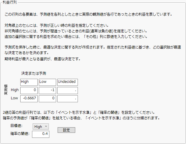 詳細については、第 “3水準以上の利益行列の例”を参照してください。モデル化で利益行列を使用する例については、『予測モデルおよび発展的なモデル』の「パーティション」章を参照してください。