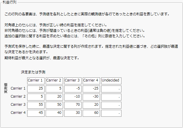 この利益行列の値がどのように割り当てられたのかを理解するために、4つの航空会社Carrier 1~Carrier 4を使用して顧客に対応している旅行代理店について考えてみましょう。旅行代理店は、販売した各航空券について、顧客が選んだ航空会社に応じた利益を得ます。旅行代理店は、航空会社を顧客に勧めた、つまり予測した段階で、航空券を予約し、予約金を支払います。顧客が予測された航空会社の使用を決めた場合、予約金を差し引いた所定の金額が旅行代理店の利益となります。しかし、顧客が別の航空会社を選んだ場合は、支払い済みの予約金が無駄になるうえ、別の予約金を払わなければならなくなります。旅行代理店の利益は、間違った予測のため少なくなります。