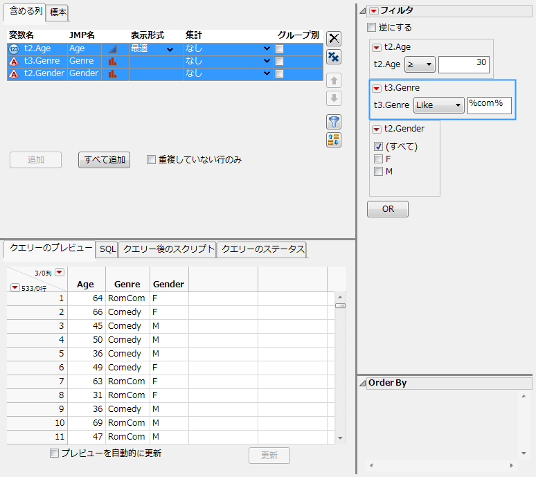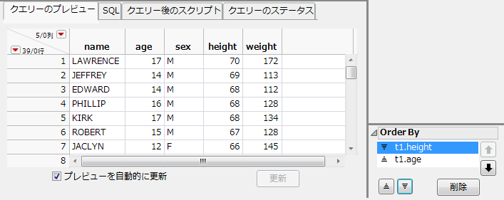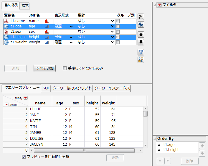 プレビューのロードに時間がかかり過ぎる場合は、[プレビューを自動的に更新]をオフにします。データのビューを更新するには、[クエリーのプレビュー]タブの下にある[更新]をクリックします。大規模なデータベースを使用することが多い場合は、「クエリービルダー」の環境設定にあるプレビューオプションの変更を検討してください。また、プレビュー可能な行の最大数を制限することを検討してください。JMPの[クエリービルダー]の環境設定で、[プレビュー表示する最大行数]の値を変更します。