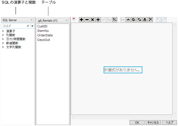 計算式エディタの左側のリストには演算子と関数があります(計算式エディタを伴う計算列ウィンドウ)。データベースに基づいてサーバーのタイプを変更しなければならない場合があります。