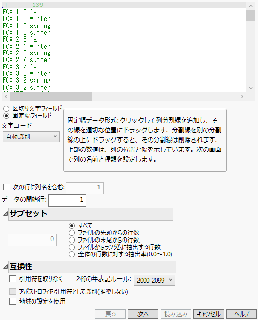 ファイルの構造が自動認識され、区切り文字で区切られたテキストか、固定幅フィールドのテキストの読み込みオプションのいずれかが表示されます。認識されたファイル構造が間違っていた場合は、[区切り文字フィールド]または[固定幅フィールド]のいずれかのラジオボタンをクリックし、適切な形式でデータを読み込みます (たとえば、ファイルが実際には区切り文字で区切られているのに、固定幅データ用のウィンドウが表示される場合があります)。