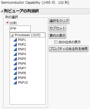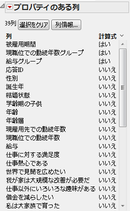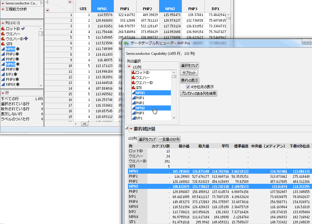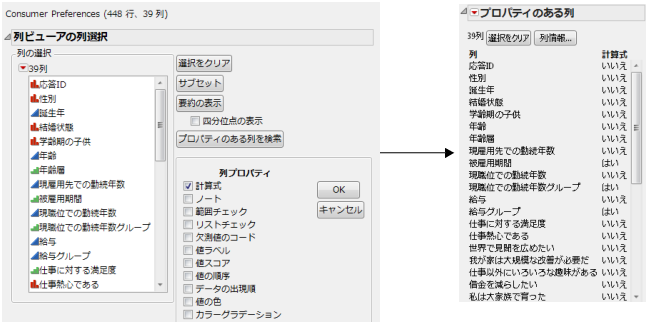列ビューアでは、属性、プロパティ、統計量に基づいて列をすばやく選択でき、列の数が多いデータテーブルでは特に便利です。列の要約統計量やプロパティの表示、データのサブセットなどが可能です。また、「列ビューア」ウィンドウの列は、データテーブルの列にリンクしています(列ビューアとリンクしている列)。