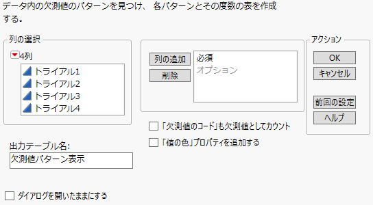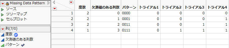 2行目は、「トライアル4」の値だけが欠測している行が、2行あることを示しています。