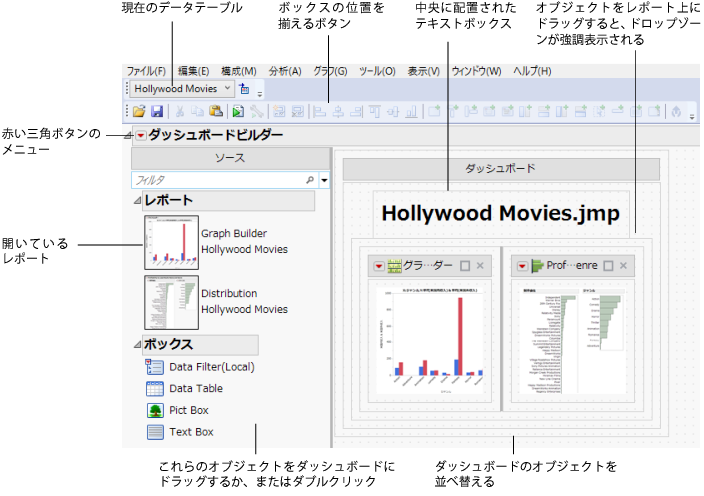 「ダッシュボードビルダー」ウィンドウは、作成中のダッシュボードを示しています。左側のパネルにある2つのレポートは、「Hollywood Movies.jmp」サンプルデータテーブルから生成されたものです。これらのレポートが右側のパネルに追加されています。また、ダッシュボードにテキストボックスが追加され、中央に配置されています。ご覧のとおり、このテキストボックスには「Hollywood Movies.jmp」というテキストが表示されています。