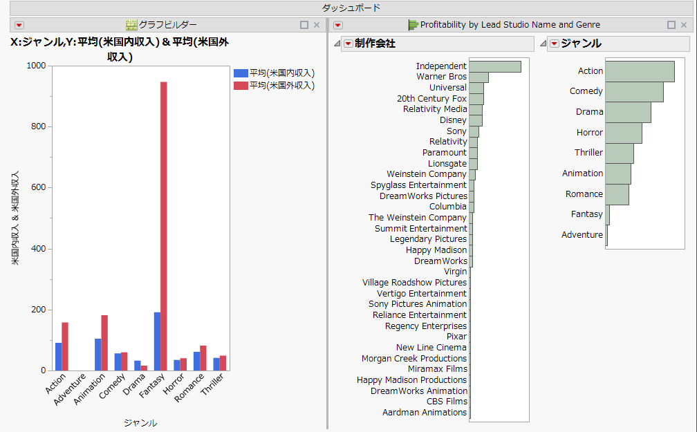 JMPでは、1つのプラットフォームの枠を超えた、独自のJMPコンポーネントを作成することができます。ダッシュボードビルダーを使えば、複数のレポートを結合して1つのダッシュボードを作成し、定期的にレポートを作成および表示することが可能です。JSLの知識は不要です。テンプレートを使用し、レポートコンポーネントをクリックして、グラフや画像を挿入するだけで、ダッシュボードが出来上がります。また、ダッシュボードビルダーを使わずに、ウィンドウを結合してダッシュボードを作成することもできます。