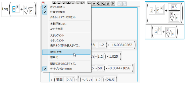 JMPの計算式エディタでは、関数の微分を見つけて表示できます。強調表示した関数の引数(1つの変数名)について微分されます。そのため、xについて微分するためには、入力する式の引数の1つがxである必要があります。キーパッドの横の赤い三角ボタンのメニューに[微分した式]コマンドがあります。