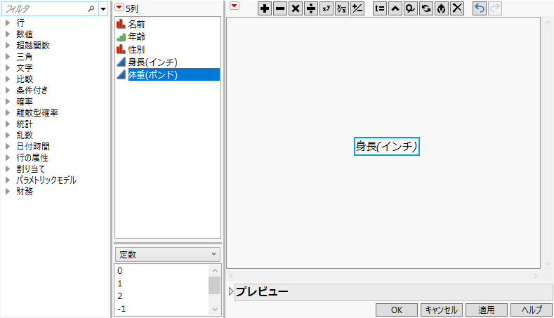 数値を入力するか、[定数]が選択された計算式エレメントブラウザで示されているように、中央のパネルで[定数]を選択します。次に、表示されるリスト(0、1、2、-1、pi、e)で値をクリックします。枠で囲まれたボックスにその値が表示されます。