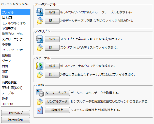 「JMPスターター」ウィンドウ(Windows)は、Windowsの「JMPスターター」ウィンドウです。Macintoshの「JMPスターター」ウィンドウも同様です。