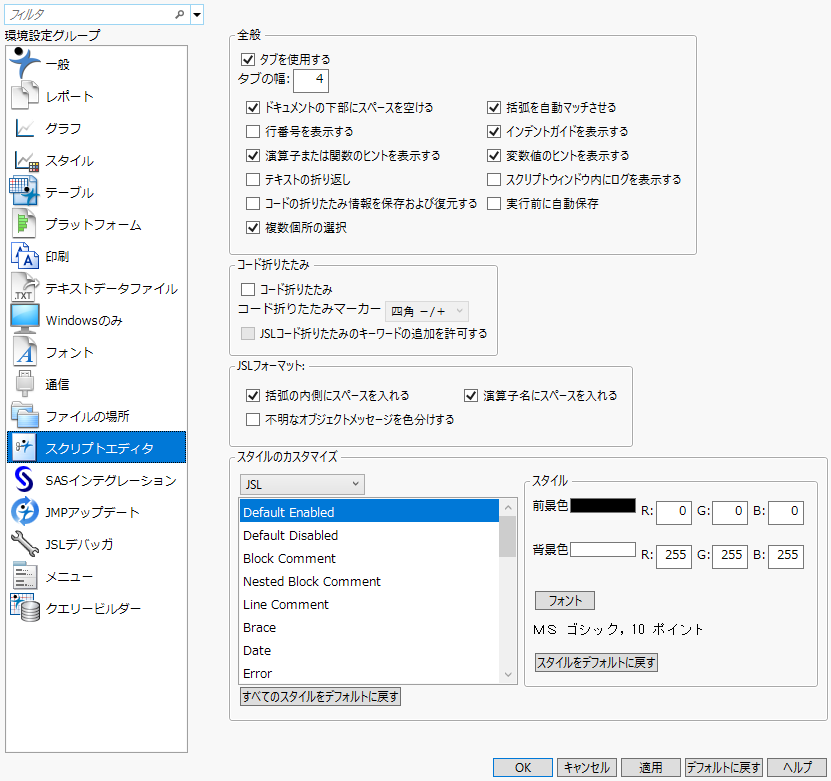マーカーの外観は、「JSLコードの折りたたみマーカー」のドロップダウンメニューで選択できます。詳細については、『スクリプトガイド』の「スクリプト作成のツール」章を参照してください。