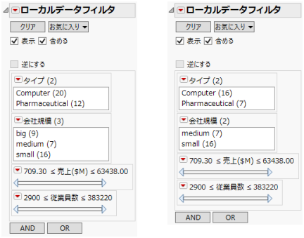 ローカルデータフィルタでは、変数の各水準の度数(除外されている行を含む)がデフォルトで表示されます。除外されている行を度数から差し引くには、「ローカルデータフィルタ」の赤い三角メニューで[除外されている行もカウント]の選択を解除します。