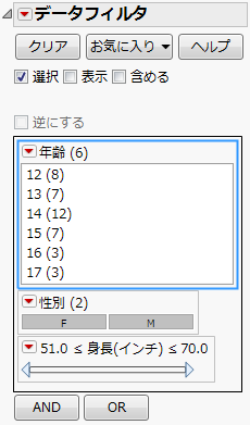 メモ: データテーブルの行の選択状態だけが入れ替わり、「データフィルタ」ウィンドウでの条件の選択状況は変化しません。「データフィルタ」ウィンドウでの選択状況を入れ替える場合は、列の赤い三角ボタンのメニューから[選択の逆転]を選択します。