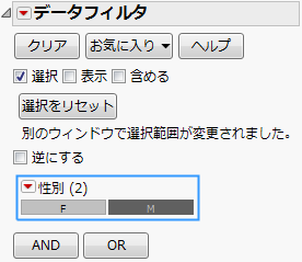 「データフィルタ」で行属性を設定した後で、データテーブルで行属性を変更したり、グラフやプロットで点を選択したりすると、「データフィルタ」での選択範囲と、データテーブルでの選択範囲が一致しなくなる場合があります。このような場合は、「データフィルタ」ウィンドウに「別のウィンドウで選択範囲が変更されました」という警告メッセージが表示されます。また、[選択をリセット]ボタンも表示されます。[選択をリセット]ボタンをクリックすると、データテーブルでの選択範囲が、「データフィルタ」での選択範囲に合うように変更されます。