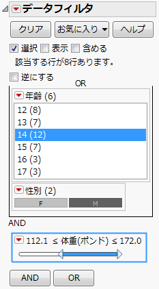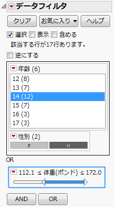 「データフィルタ」で複数の名義尺度または順序尺度の列が選択されている場合、フィルタ基準を1つ選択する前に、前回選択した基準を選択解除します。たとえば、「Big Class.jmp」を使って、「データフィルタ」で「性別」列(名義尺度)と「年齢」列(順序尺度)を指定し、 「性別」で[M](男子)を選択している場合、「年齢」の[12]をクリックした時点で、[M]の選択は自動的に解除されます。つまり、男子か女子かにかかわらず、12歳の生徒全員が選択されます。一方、[自動クリア]をオフにした場合は、男子であり、かつ12歳の生徒だけが選択されます。[自動クリア]はデフォルトでオンになっています。