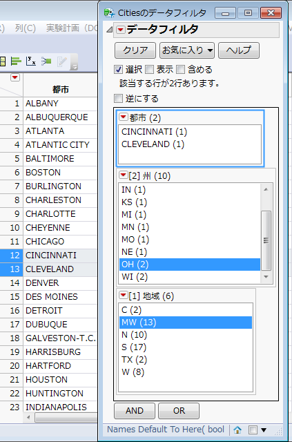 中西部のオハイオに位置する都市だけが、データテーブルで選択されます。「データフィルタ」ウィンドウでは、「州」リストには中西部の州だけが、「都市」リストにはオハイオ州内の都市だけが表示されます。詳細については、[条件付き]オプションの使用を参照してください。